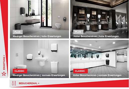 Professionelle Hilfestellung bietet  der nordeuropäische Spezialist für Sanitärraumausstattung Metsä Tissue mit seiner B2B-Marke Katrin. Das Waschraumkonzept wurde entwickelt, um den unterschiedlichen Hygieneanforderungen von Besuchern in niedrig- bis hochfrequentierten Waschräumen nachzukommen, die sowohl einfache als auch exklusive Lösungen erwarten. Auf seiner Homepage finden Entscheidungsträger maßgeschneiderte Ausstattungsempfehlungen für ihren spezifischen Bedarf.
